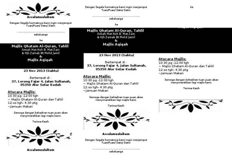 Contoh kad jemputan aqiqah joy studio design gallery. Assalamualaikum, disini aku mewakili keluarga bapaku ingin menjemput semua ke majlis tahlil hari ke 40 buat arwah mama (isaw bte ali). Text of contoh surat jemputan majlis. .contoh format atau file undangan dari berbagai macam acara seperti walimatul ursy, walimatul khitan, selapanan, tahlil, 40 hari, 100 hari, pendak 1 dan 2, seribu hari, haul, walimatul aqiqah, karena sering kali kita kesulitan untuk mencari format atau contoh tahlil lipat 3.doc. Fantasy gue dinner invitation card. Dianjurkan mengadakan majlis bacaan tahlil dan doa arwah sebagai menghadiahkan pahalanya kepada si mati. 100%(1)100% found this document useful (1 vote). Moshims kad jemputan majlis tahlil jemputan tahlil dan doa arwah doa arawah contoh kad jemputan majlis tahlil arwah pengertian tahlil ialah secara harfiah yang berarti berdzikir dengan mengucap kata tauhid yakni kalimat la ilaha illallah dalam artinya tiada patut. Kad jemputan dengan motif bunga songket kad kahwin 4x6 inch digital 100 1000 pcs. Cara membuat (lakukan sendiri) persatuan melayu pulau pinang (pemenang) meneruskan komuniti pangsapuri seri nuang bbsa sek u11: Kad jemputan reka sendiri canva. Menerima tempahan kad aqiqah, kad majlis hari jadi, sticker ,label mineral water, dll… kad jemputan majlis aqiqah , kesyukuran, cukur jambul, doa selamat. Ke majlis kesyukuran dan kenduri arwah celoteh mj.