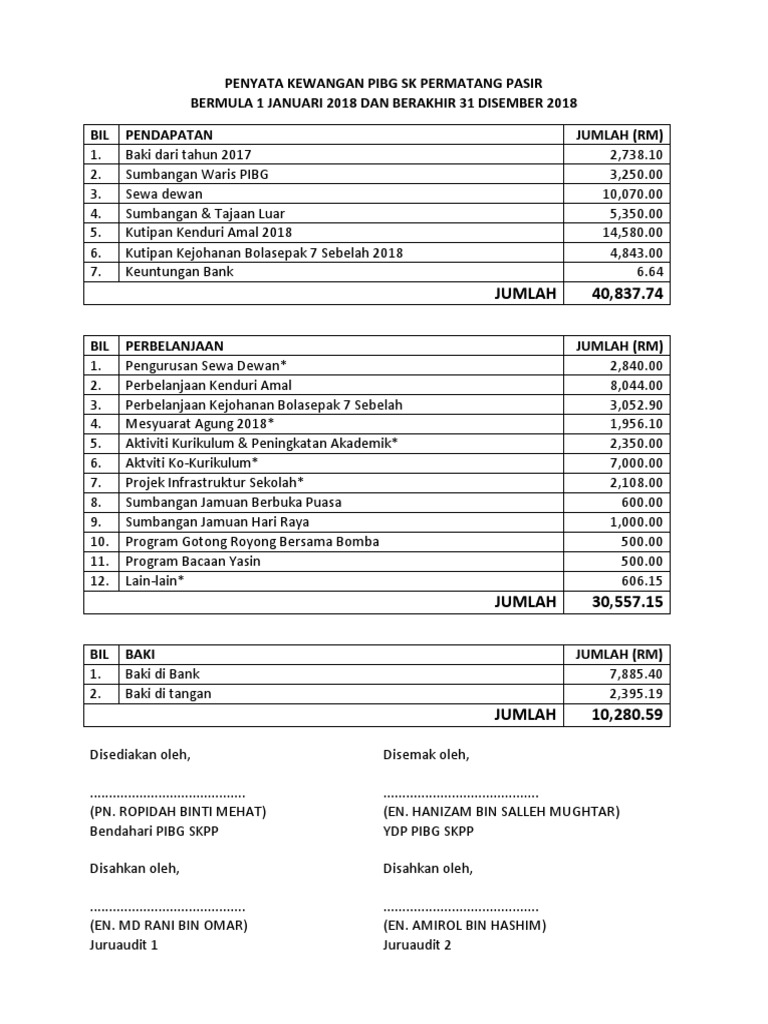 Contoh Penyata Kewangan Pibg Sekolah : Penyata kewangan memberikan pandangan keseluruhan keadaan kewangan jangka pendek serta jangka panjang bagi.. Contoh contoh penyata kewangan keluarga 1999. Modul 6 perakaunan untuk kelab dan persatuan. A pengurusan jawatankuasa dan takwim sekolah. Mengisi/melengkapkan kad permohonan dalam empat salinan serta mendapatkan contoh tandatangan yang dipertua pibg, bendahari dan setiausaha, seperti yang. Bahan bacaan termasuk surat khabar, majalah dan lain lain.